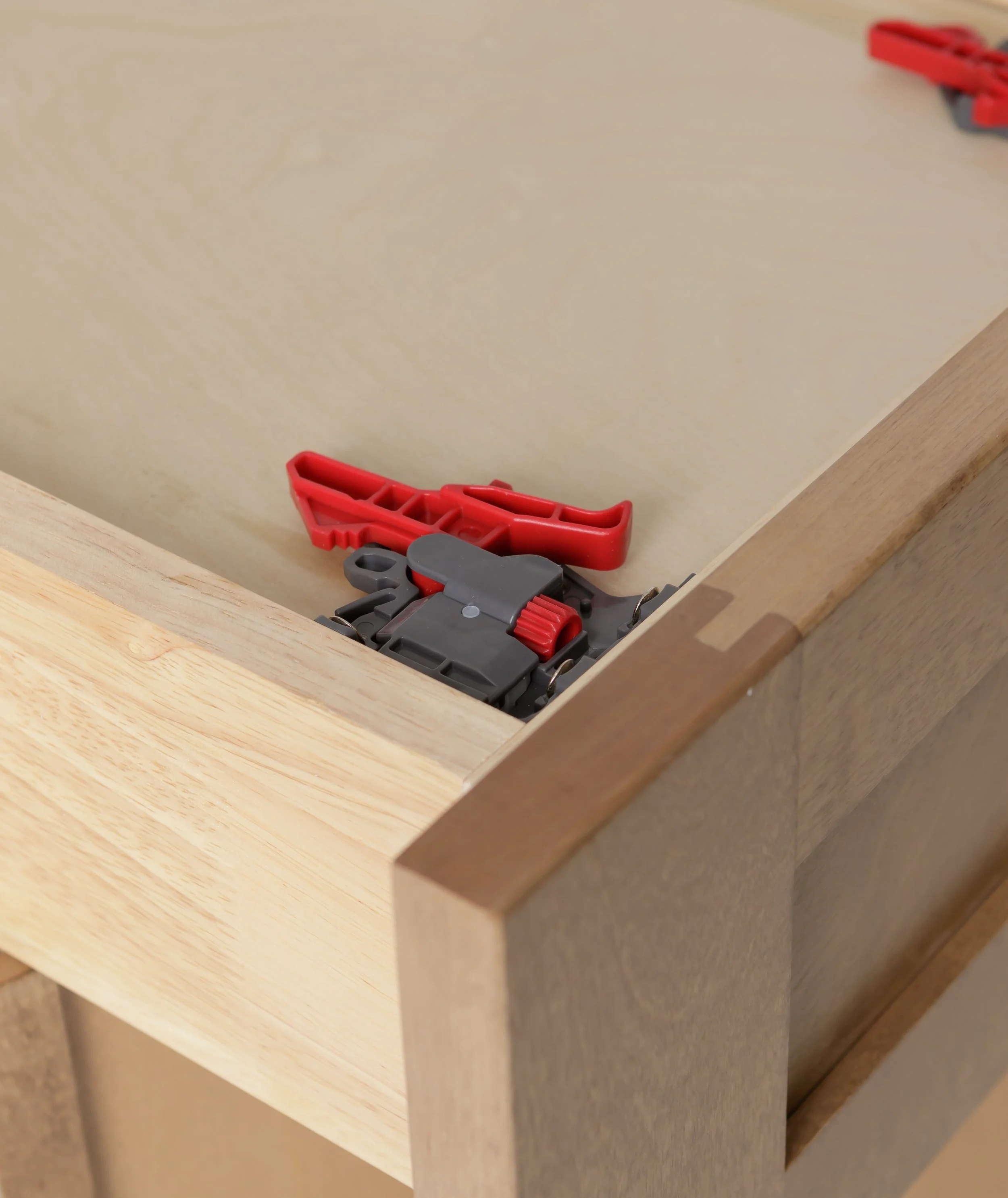 Base Cabinet Face Frame Connection Detail. Dovetailed and Secured with Metal Corner Brackets